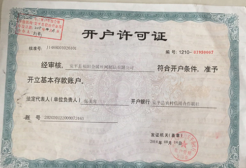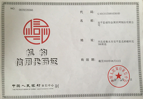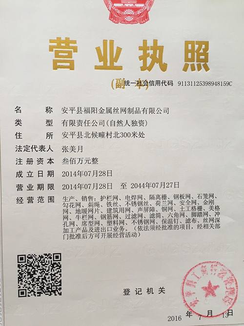 您當前位置:建筑網(wǎng)片/安平護欄網(wǎng)廠家/電焊網(wǎng)/不銹鋼網(wǎng)/金鋼網(wǎng)-安平縣福陽金屬絲網(wǎng)制品有限公司 > 資質證書
