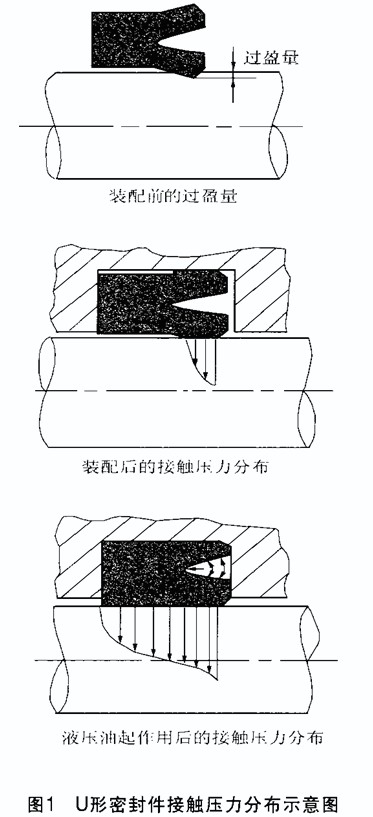 唇形密封件是指受壓呈唇形并具有壓力強(qiáng)化密封作用的一類密封件或襯墊。其結(jié)構(gòu)形式很多,除標(biāo)準(zhǔn)的V形、U形、Y形、L形和J形外,還有由這些形狀演變而來的各種特殊形狀。唇形密封件的密封原理是依靠密封件唇口與配合面之間的過盈量和工作介質(zhì)的壓力使唇形密封件產(chǎn)生彈性變形,以封堵相對(duì)運(yùn)動(dòng)兩零件之間的間隙,達(dá)到密封的目的。圖1是U形往復(fù)運(yùn)動(dòng)密封件( U形密封件是油壓缸中使用廣泛的油封,它是一種典型的唇口密封件,無論用于活塞或是活塞桿都能獲得良好的密封效果。主要應(yīng)用于重載行走機(jī)械或工業(yè)液壓中的活塞或活塞桿密封。)裝配和接觸壓力的分布示意圖,密封件裝入安裝槽時(shí)內(nèi)唇口與桿件相接觸發(fā)生變形,當(dāng)液壓油加壓后其整個(gè)滑動(dòng)面與桿件的表面完全貼合在一起。