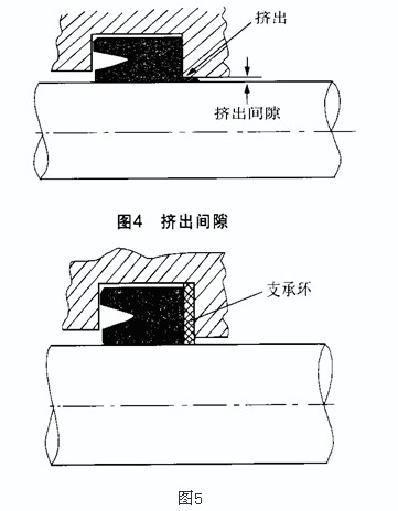 如果唇形密封件所受壓力與其背后的間隙不相適應(yīng),或支承環(huán)使用不當(dāng),會(huì)使唇形密封件的跟部進(jìn)入間隙而損壞,從而造成漏油(見圖4)。合理設(shè)置支承環(huán)可防止唇形密封件跟部被擠出(見圖5)。