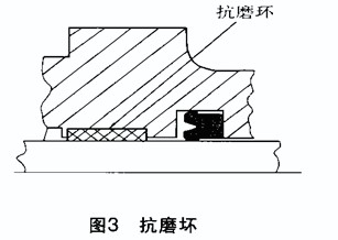 微動(dòng)時(shí)低壓過高或行程過小,均會(huì)使油膜破裂、潤(rùn)滑不足,造成表面鏡面磨損,應(yīng)改進(jìn)唇形密封件結(jié)構(gòu),增加抗磨環(huán)(見圖3);側(cè)壓過大,使抗磨環(huán)或活塞、軸承側(cè)向負(fù)茍過大,導(dǎo)致軸承磨損不均,若抗磨環(huán)不適合,也會(huì)造成滑動(dòng)面不均勻磨損,應(yīng)當(dāng)更換抗磨環(huán);軸的偏心過大,使油封安裝孔與軸線不同心,活塞桿與缸頭、液壓缸缸筒和活塞的偏心值超出允許值,使唇形密封件不均勻磨損,從而造成漏油。此時(shí),應(yīng)重新調(diào)整,使偏心量在允許的范圍內(nèi)。此外,配合面粗糙度大,會(huì)造成唇形密封件磨損量增大。實(shí)踐證明,軸表面粗糙度Ra=0.8~1.6μm、孔的表面粗糙度Ra=0.8~3.2μm時(shí),就會(huì)使唇形密封件達(dá)到合理的壽命。