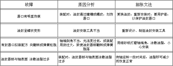 骨架油封屬于動密封元件,“臨界油膜”的存在,是油封密封的必要條件,無泄漏的密封是不允許的,也是不可能的。因為潤滑油膜的存在是保證油封刃口實現(xiàn)潤滑摩擦鎖必不可缺的,而潤滑油膜的存在,使得一定量的泄漏不可避免。對旋轉(zhuǎn)用油封,在使用過程中,如果在運行初期的50~100小時之內(nèi)發(fā)生微量的泄漏是允許的。隨著運轉(zhuǎn)時間的加長,泄漏會逐漸停止,往往這樣的油封壽命比較長。在有效使用期限內(nèi),微量的泄漏是允許的,否則,必須按照下述油封的常見故障原因及排除方法進行處理。