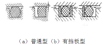 O形圈密封的原理如圖(a)所示,O形圈裝入密封槽后,其截面受到壓縮后變形。在液壓力時,靠O形圈的彈性對接觸面產生預接觸壓力,實現初始密封,當密封腔充入壓力油后,在液壓力的作用下,O形圈擠向槽一側,密封面上的接觸壓力上升,提高了密封效果。任何形狀的密封圈在安裝時,保證適當的預壓縮量,過小不能密封,過大則摩擦力增大,且易于損壞,因此,安裝密封圈的溝槽尺寸和表面精度按有關手冊給出的數據嚴格保證。在動密封中,當壓力大于10MPa時,O形圈就會被擠入間隙中而損壞,為此需在O形圈低壓側設置PTFE或尼龍制成的擋圈,其厚度為1.5~2.5mm,雙向受高壓時,兩側都要加擋圈, 其結構如圖(b)所示。