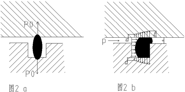 圖1為安裝在端蓋外圓與液壓油缸內(nèi)壁接觸位置的是端蓋靜密封圈;安裝在活塞與活塞桿之間的是活塞靜密封圈。這兩個部位的密封圈都是液壓油缸內(nèi)的靜密封,端蓋靜密封是防止液壓油從端蓋和缸筒之間的縫隙中漏出,單面承壓,要求這兩個部位的油缸密封件具有防擠出能力強,密封效果好等;活塞靜密封是雙向承受壓力的,防止液壓油從活塞和活塞桿之間漏出,要求防擠出能力強,密封效果好等。常見的靜密封圈為O型密封圈加擋圈,O型封圈是一種截面為圓形的橡膠圈,其材料主要為丁腈橡膠或氟橡膠,是液壓傳動系統(tǒng)中使用廣泛的一種密封件產(chǎn)品。它主要用于靜密封和往復(fù)運動密封,O型密封圈裝入密封溝槽后,其界面承受接觸壓縮應(yīng)力而產(chǎn)生變形,當沒有介質(zhì)壓力時,O型密封圈在自身的彈性力作用下,對接觸面產(chǎn)生一個預(yù)接觸應(yīng)力p0,如圖2a所示。而當容腔內(nèi)充入有壓力的介質(zhì)后,則在介質(zhì)壓力p的作用下,O型密封圈發(fā)生位移,移向低壓側(cè),且其彈性變形進一步加大,填充和封閉了密封間隙a此時,作用于密封副偶合面的接觸壓力上升為p0+p=pm,從而大大增加了密封效果,如圖2b所示。