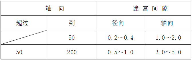 在軸向組合成凹凸式迷宮通路的密封件產(chǎn)品,多用于整體式軸承箱。徑向組合成凹凸式通路的迷宮密封,多用于剖分式軸承箱。軸有傾斜時(shí),迷宮通路亦傾斜設(shè)置,以免凹凸部相互干涉。迷宮式密封,多用于剖分式軸承箱。軸有傾斜時(shí),迷宮通路亦傾斜設(shè)置,以免凹凸部相互干涉。迷宮式密封的徑向及軸向間隙,通常采用下表所示值: